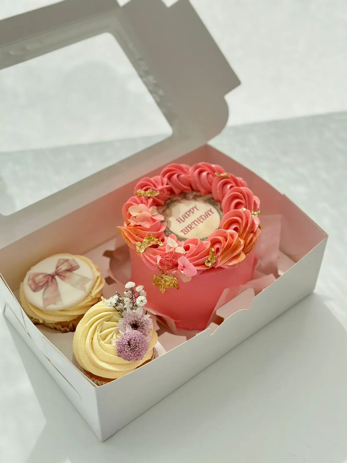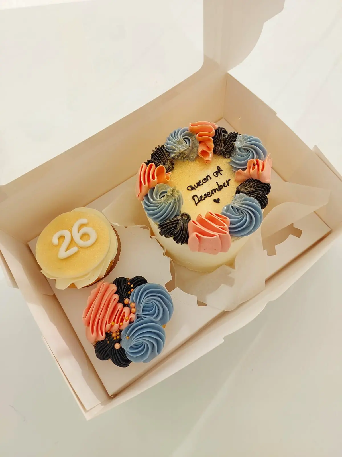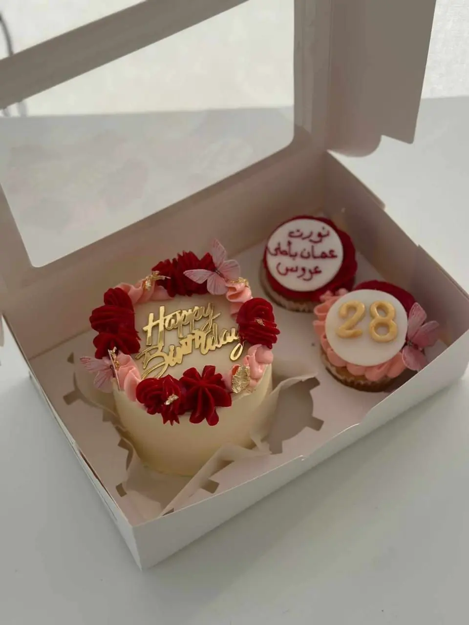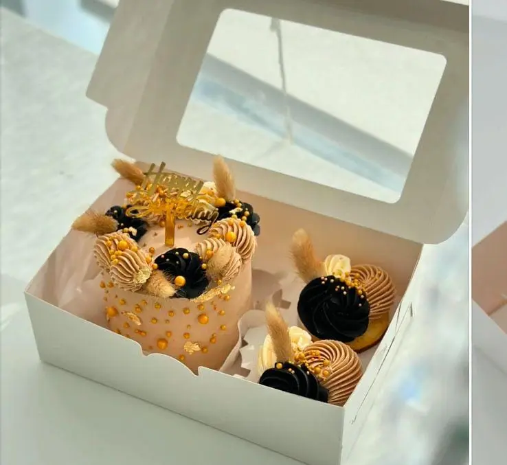 - بوكس الميني كيك والكب كيك (15 دينار): بوكس أنيق يحتوي على ميني كيك بقياس مثالي وحبتي كب كيك شهية.