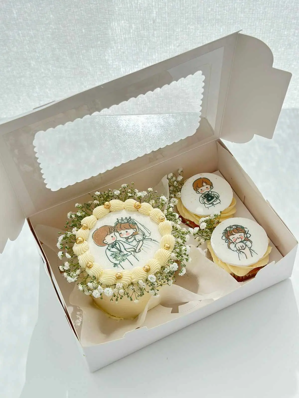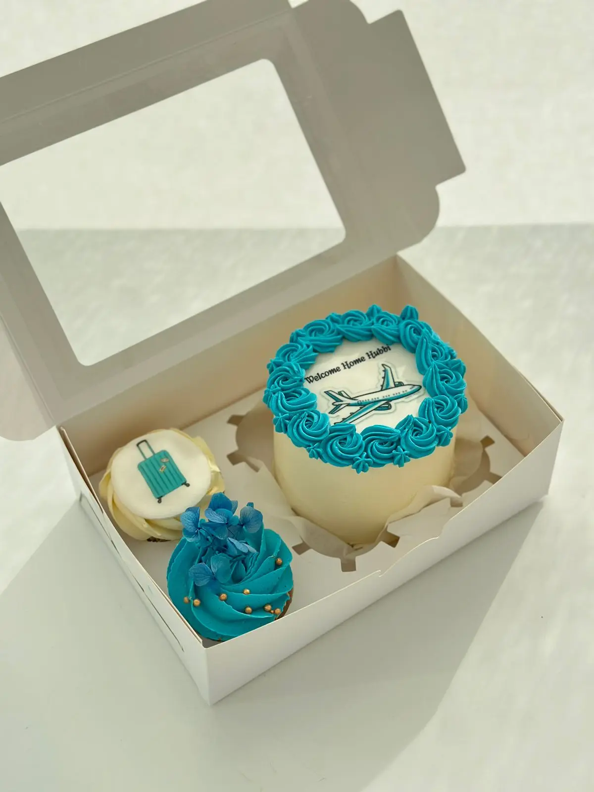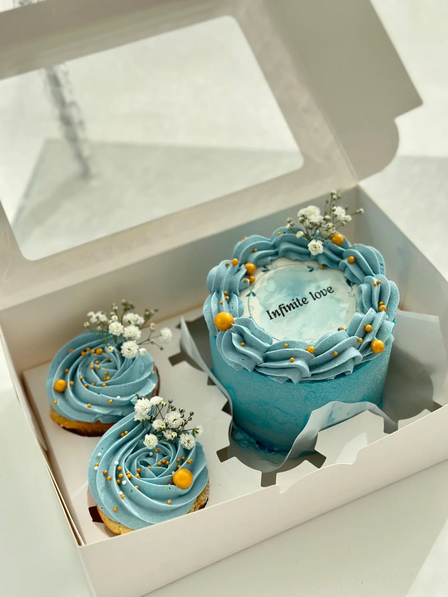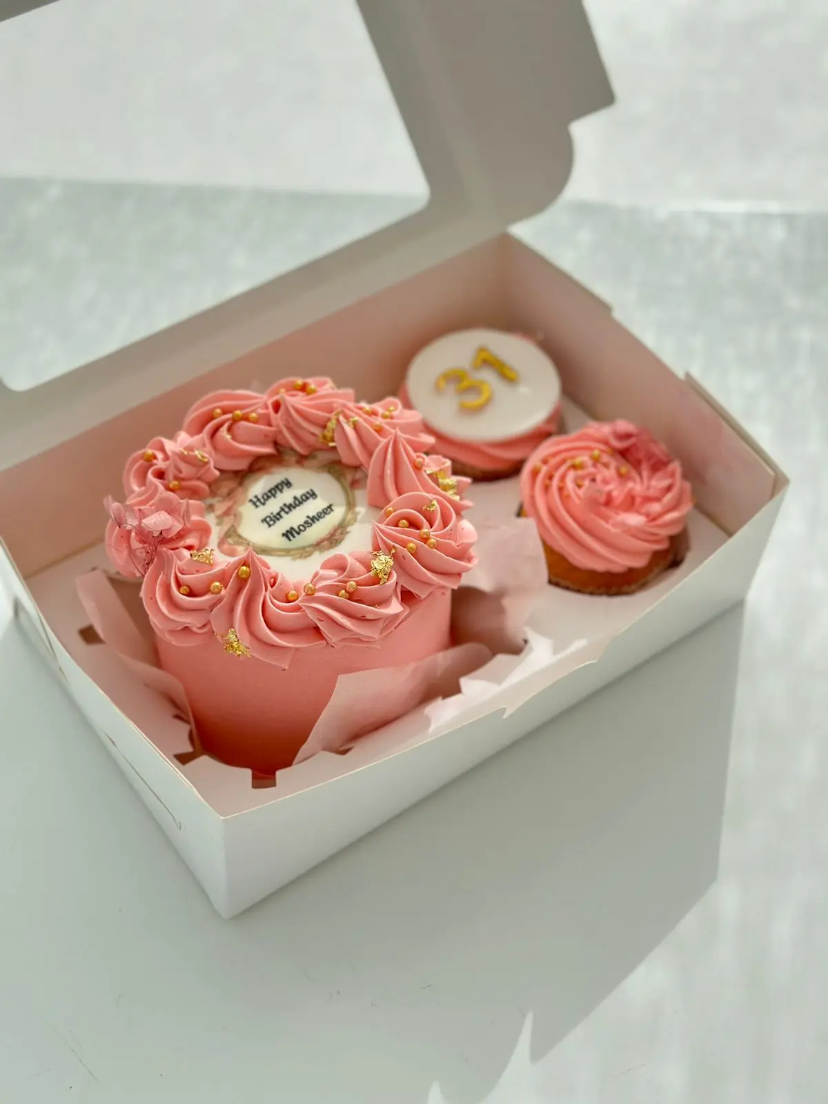 - بوكس الميني كيك والكب كيك (15 دينار): بوكس أنيق يحتوي على ميني كيك بقياس مثالي وحبتي كب كيك شهية.