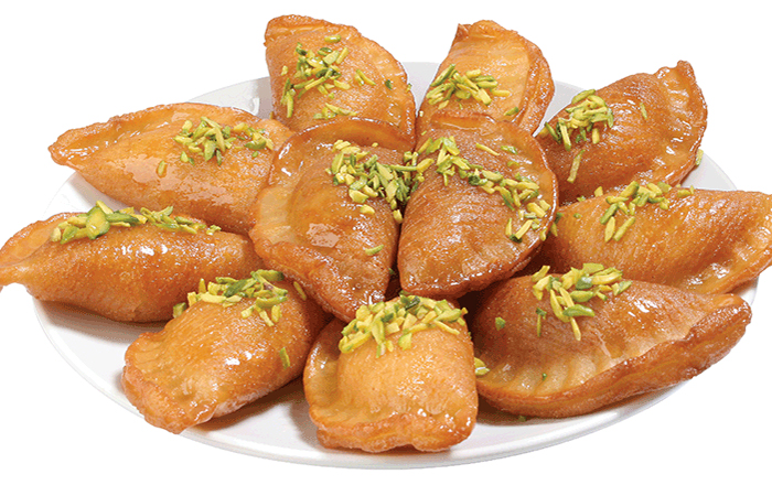 - البقلاوة: بأنواعها المختلفة، مثل "البقلاوة التركية" و"البقلاوة بالفستق الحلبي" و"البقلاوة بالقشطة".