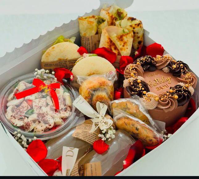 فهو يُلبي جميع احتياجاتك، ويُقدم لزوجك تجربة فريدة من نوعها تجمع بين الفخامة والذوق الرفيع، بدءًا من تشكيلة السندويشات اللذيذة، وصولًا إلى قالب الميني كيك وحبتي الكوكيز المُغرية. كما أن إضافة الوردة الحمراء وكرت المُعايدة يُضفي لمسة رومانسية على الهدية، ويجعلها أكثر تميزًا.